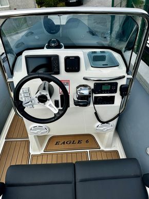 Design & Performance Powered by a Suzuki 115hp fly-by-wire engine with 80 hours, the Eagle 6 offers smooth handling and efficient performance. The Military Grey ORCA Hypalon tubes, complemented by black seating and mocha brown Seadek flooring, deliver a sharp, modern look. Seastar hydraulic steering ensures precise control, while the deep ‘V’ hull provides excellent stability.