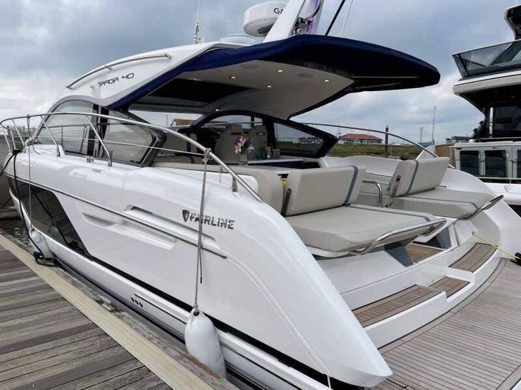 *** 2025 FAIRLINE TARGA 40 *** // Twin Volvo Penta D6 Diesels with 760HP (total). Delivery hours. This stunning Fairline Targa 40 model is a well optioned boat that includes: Volvo Interceptor handling system with Auto List & Trim // Joystick control // Bow thruster // Walnut Satin wood interior // Teak laid cockpit // Teak laid bathing platform // Eberspacher heating system // Windscreen Demist // Upgraded Garmin Navigation 16" Screen // Garmin Radar Dome // Garmin 800i AIS // Fusion PLUS upgraded audio/visual throughout with subwoofer // Wifi throughout // Cockpit canopy with pull-out sunshade // Mosquito screens to portholes // Exterior mood lighting in Blue // Interior mood lighting // Upgraded sprung mattresses.