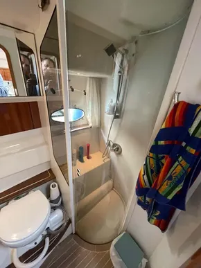 - Large heads fitted with enclosed shower, sink, mirror and storage