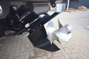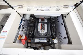 Under the rear sun pad in an insulated engine room is a Mercruiser 4.5 V6 petrol engine powering a duo prop via a bravo 3 stern drive. Sinle lever controls at the helm position with electronic trim adjustment.
