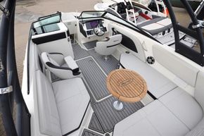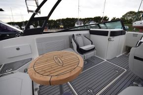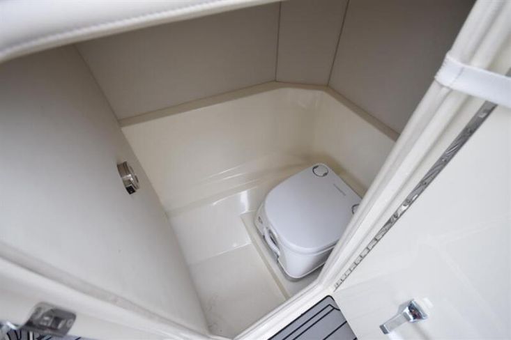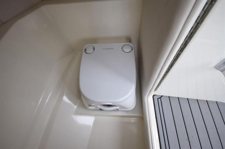 Forward is a large seating area with an infill to convert to a sun pad/day bed accessed by the split screen and door. To port is a small heads compartment with a cassette loo, this space also works well for stowage. Starboard is the helm position. There is a Simrad MFD and all of your switch gear within reach of the helm. Single lever controls with trim switch and kill cord. Both helm and copilot seats have flip up bolsters. Behind the helm is a large seating area with removable table with ample room for the family. This area is covered by a T-top/ski tower with removable bimini cover. Aft above the engine bay is a large sun pad with adjustable back rest. Part of the sun pad folds to allow for step free access to the extended bathing platform. There is a stack away bathing ladder and swim shower with pressurised water.