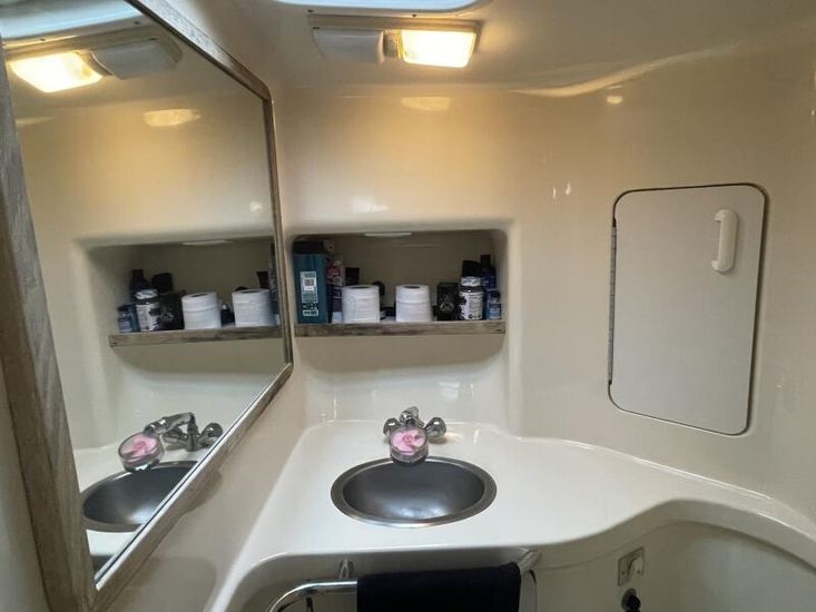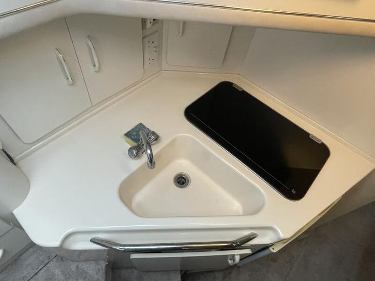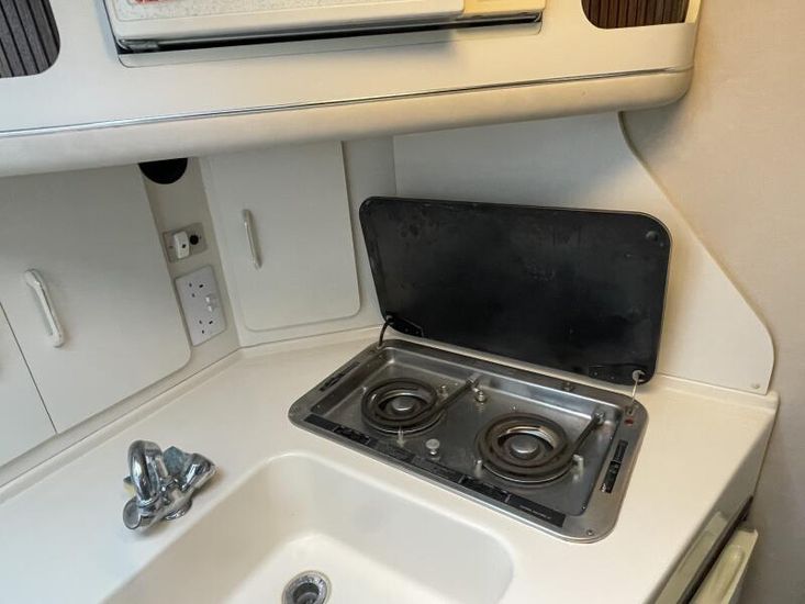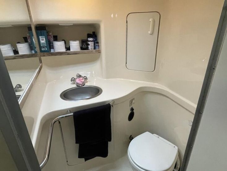 Below decks is bright and spacious enabling extended periods afloat. There are berths for 6 people over the seperate forward cabin, saloon and rear cabin/seating area. Boat is fully electric with a 2-burner electric/spirit hob, fridge and microwave oven. Moulded worktops with built in sink. Pressurised hot&cold fresh water.
