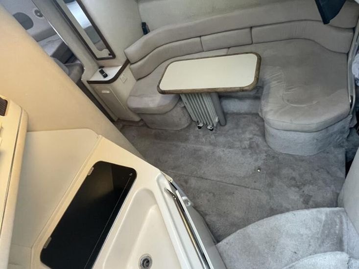 Large saloon with seating area opposite the galley. Interior is fully carpeted and all seating is finished in cream 'Alcantara'.