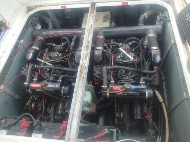Vessel powered by twin inboard petrol Mercruiser 5.7 V8 engines. These 8-cylinder, 254hp units have been well maintained by her owner with most recent service in late 2025. These are the rarer but more desirable V-drive options negating the need for stern drives whilst offer conventional shaft drives on rear mounted engines. 3-Bladed bronze propellers.