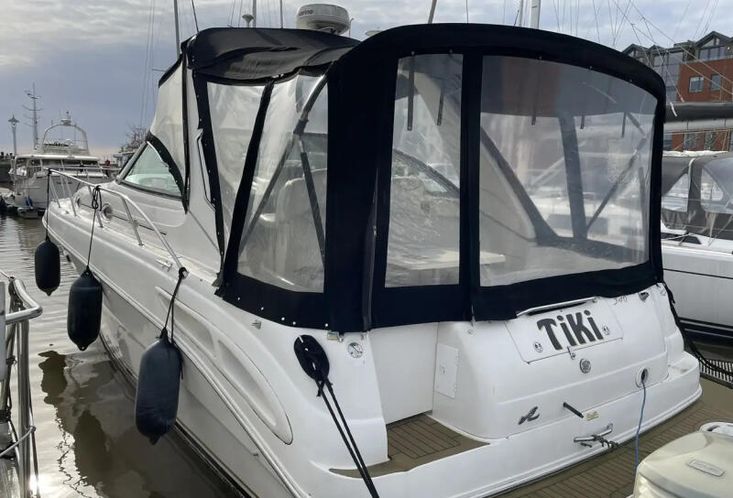 Tiki is a 38ft long x 11ft 5in wide cruiser built by Sea Ray in 2000. She is fitted with twin Mercruiser 310hp petrol inboard motor and has 6 berths.