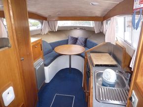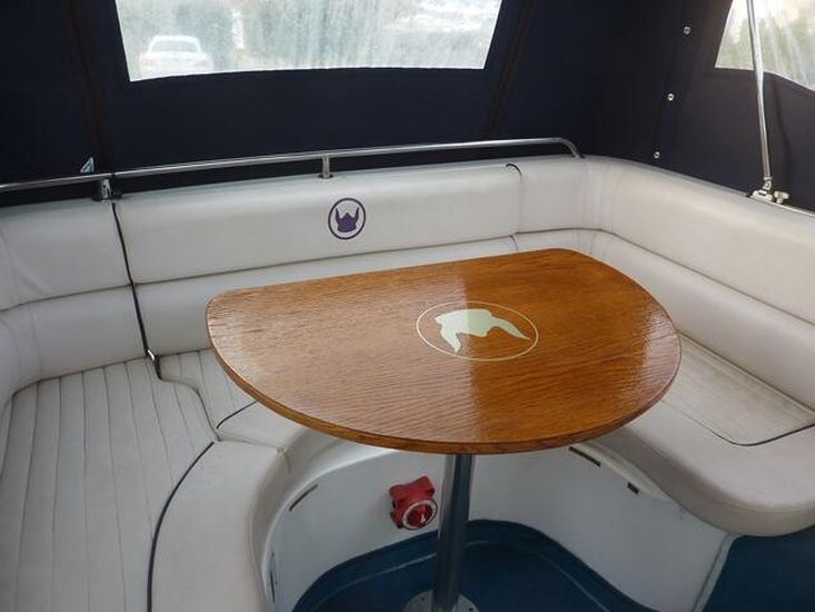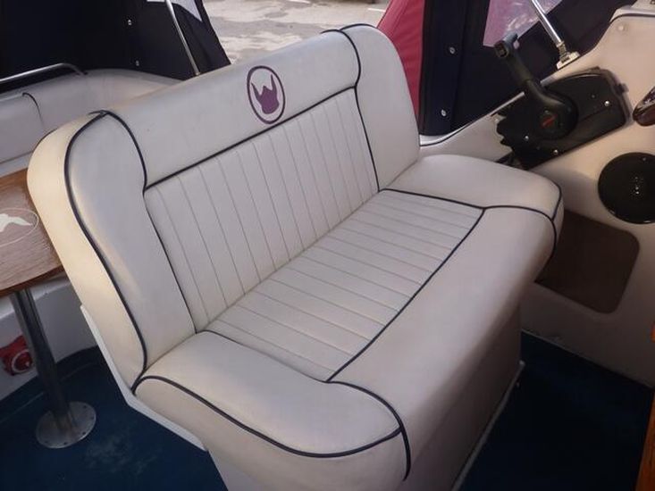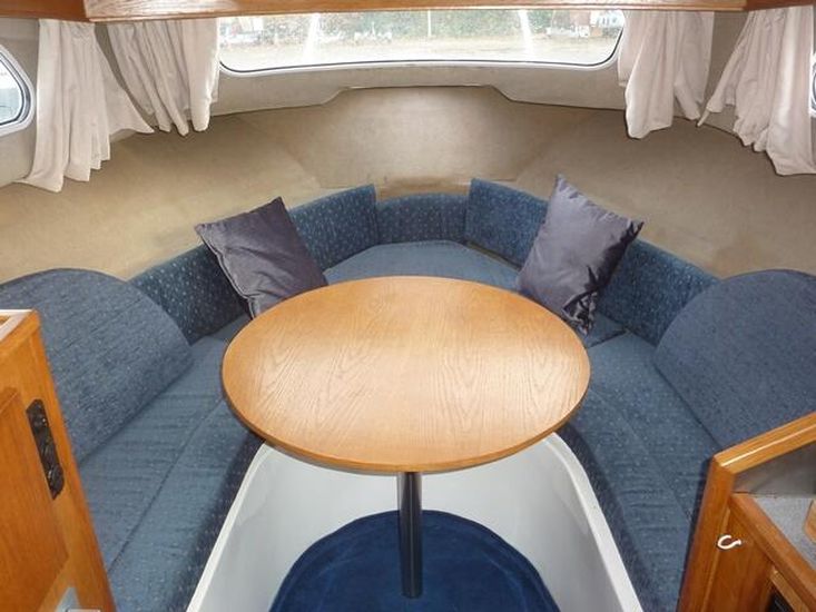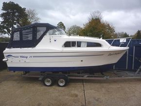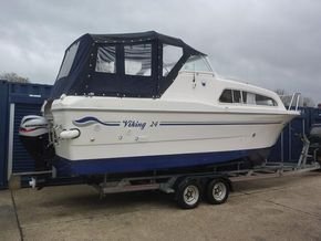 Launched 2009. 2016 30hp Mariner EFI 4 stroke power tilt, 4 berth in 2 cabins, separate shower compartment with cassette toilet, h+c water, cooker, shore power, fridge, inverter, canopy, switch panel with USB, bluetooth stereo, twin horns, ropes & fenders, chartplotter, serviced & antifouled October 2024, hull polished November 2025, boat safety certificate to June 2028. Please note the trailer is not included but delivery is available. Winter special offer FREE storage to 31st March 2026. Please call 01753 863393 for further information.